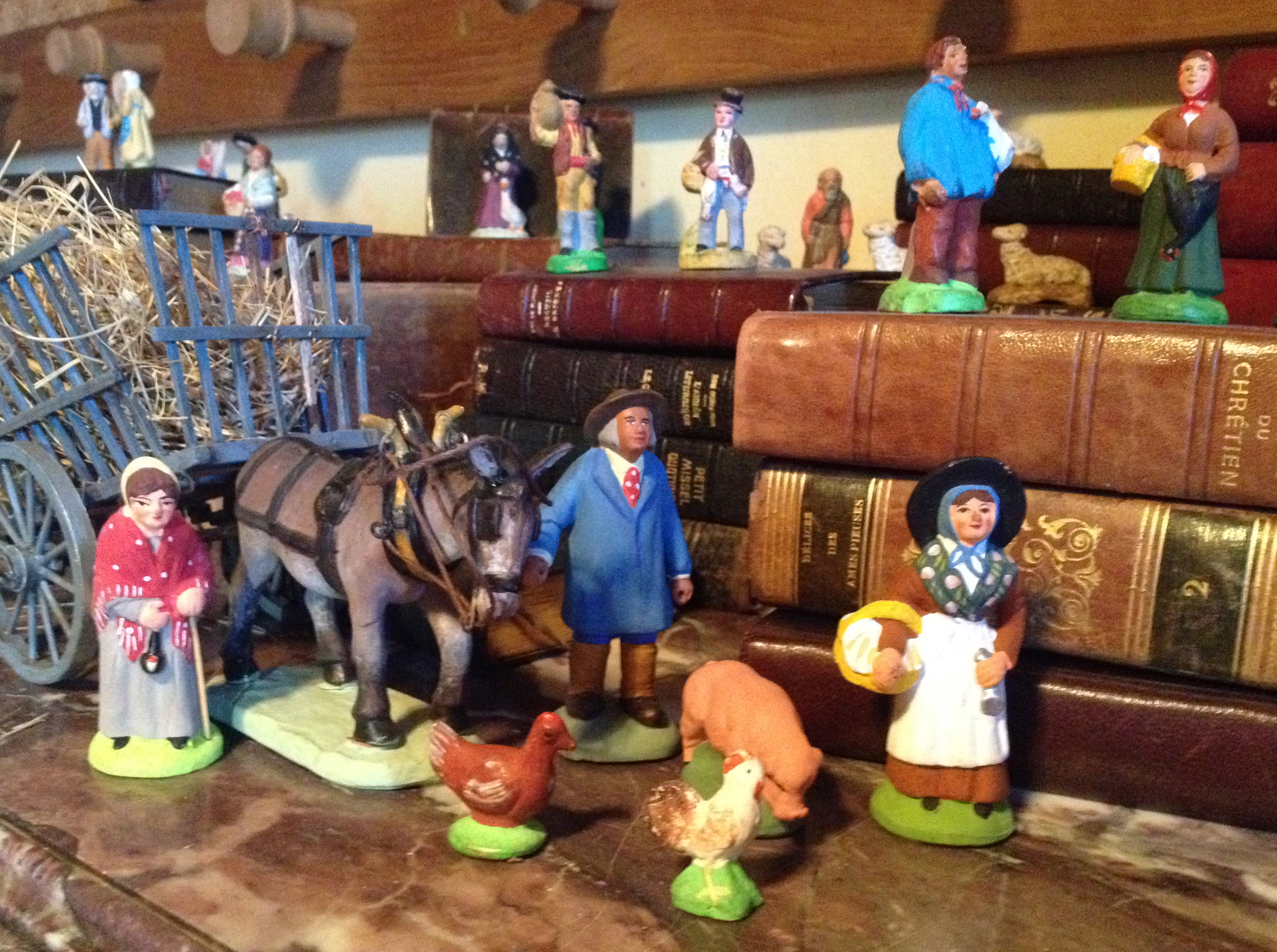Every year now I take out my collection of antique religious books and use them as the decor to suggest the landscape and grotto for my crèche that grows with added “santons” each year. Over the years our grandchildren gave us a santons representing two grandparents sitting on a little bench and a blacksmith at his forge and a friend gave us a wonderful “paysan” and his wife pulling guiding their horse and a cart of hay….