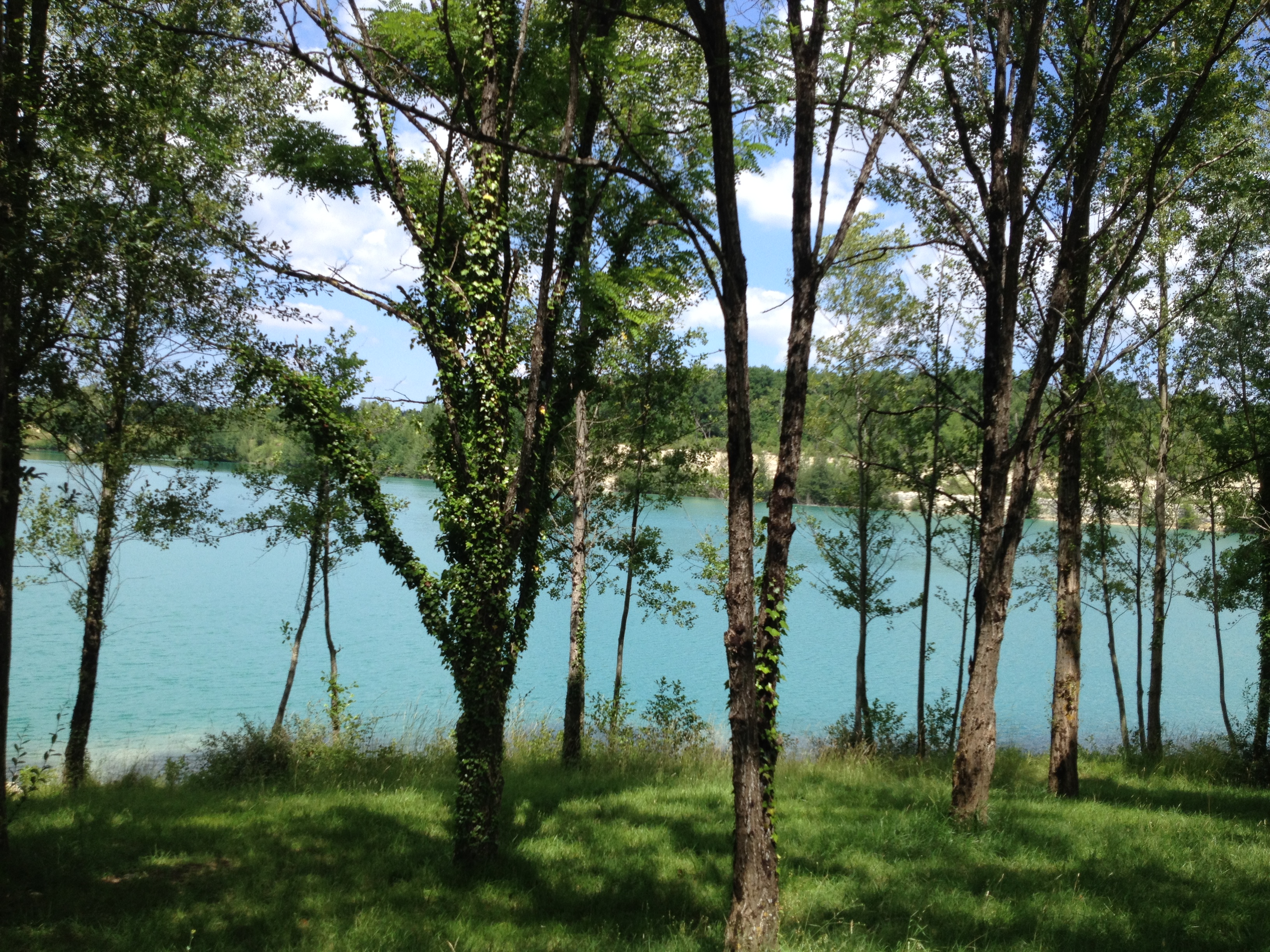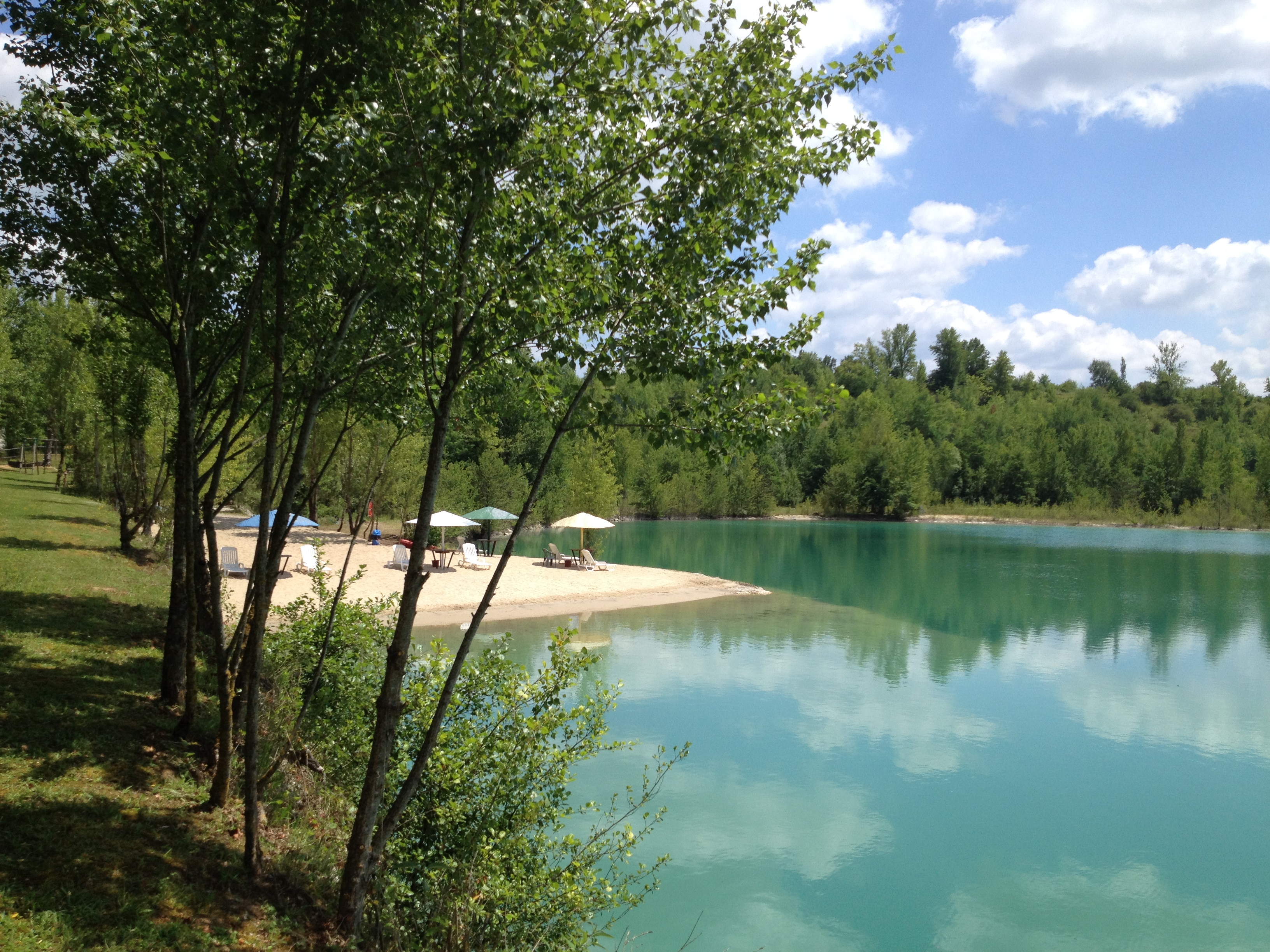 New swimming option! Two former quarries — just 2,5 kilometers or 4 minutes from the house — have been made into one large, turquoise-blue lake that looks like it came out of a travel poster for some exotic destination! I’m delighted to announce that I now have a free pass for my guests to enjoy its sandy beach and to dive into its clear blue water. Opened several years ago by French water ski champion Will Delair, the lake is maintained as a private club, which only recently began accepting non-skiing members — like us. One side of the lake is for the one and only boat and the other for swimming. However, if you’d also like to ski or ride the waves on a wake board behind the lake’s one “fairly quiet” but powerful inboard, you can reserve a tour or two with Will. The club’s restaurant and bar look out over the lake are open every day from 11 to 11.